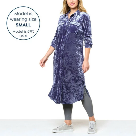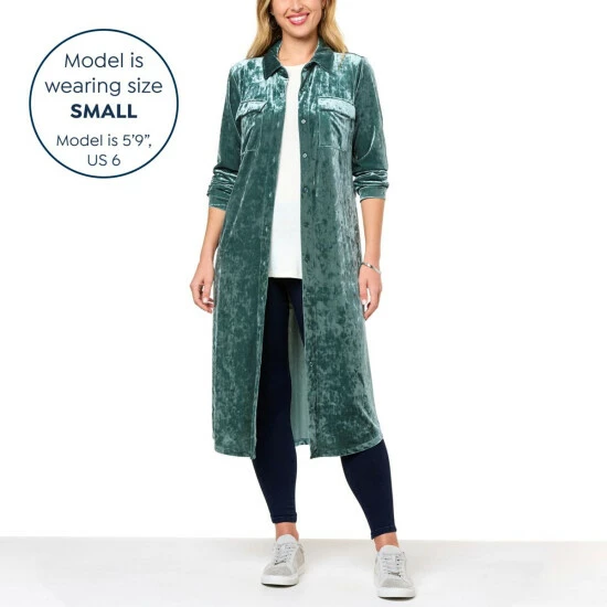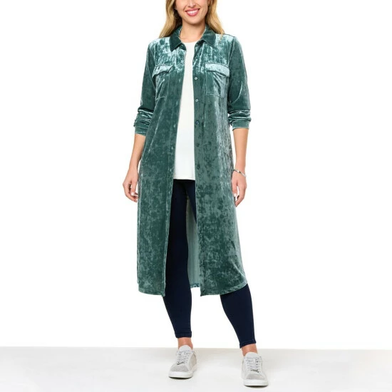 We are totally crushing on velvet this season!Add this versatile duster shirtdressto your cold-weather wardrobe for a super-stylish seasonal look. Wear it looseand unbuttoned over your favoritejeans and tee for casual weekend appeal,or button itup and slip on somechunky heeled ankle boots and bold jewelry for a look that lasts.