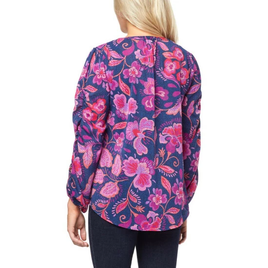 Made with soft, printed chiffon fabric, this long, shirred sleeve t-shirt is a simple, but stylish wardrobe staple you can wear on dressy days any time of year.