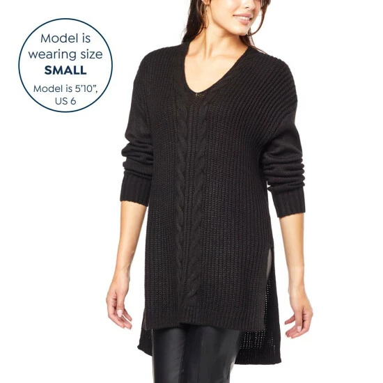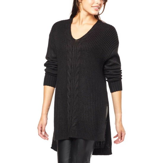 Whether you love the cold or not, we can all agree that a chunky knit sweater makes the chilly season sweeter. This tunic-lengthpulloverfits loose and long (itcovers yourbum). Complete with a V-shapedneckline and a hi-lowstep hem, this cable knit gives an effortlessly pretty vibe.