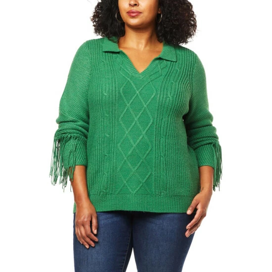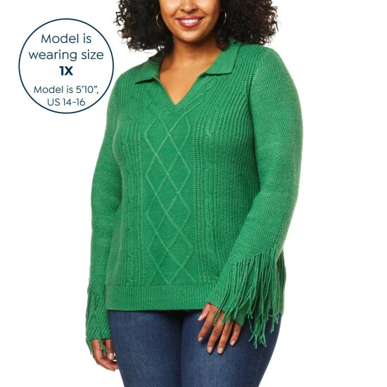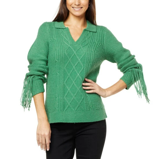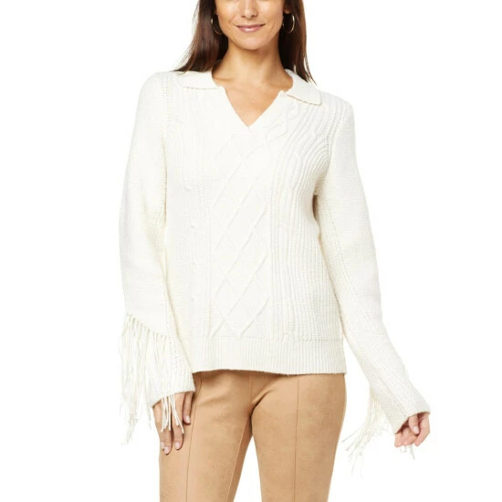 G by Giuliana Black Label Cable Knit Polo Sweater with Fringe