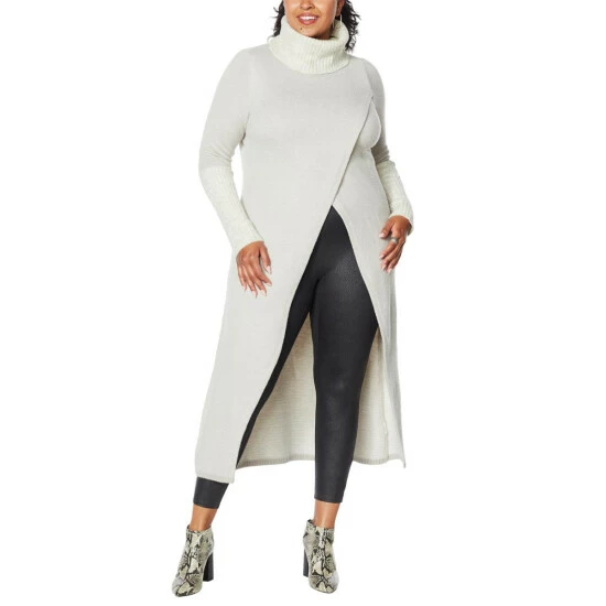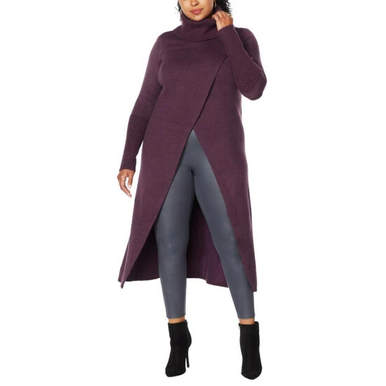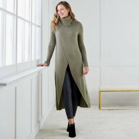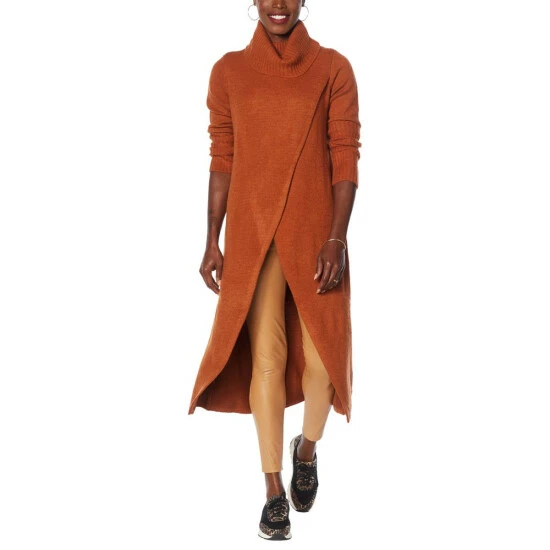 So chic, so unique. This duster-length sweater makes a fashion-forward statement with its crossover design and wide, ribbed cuffs.