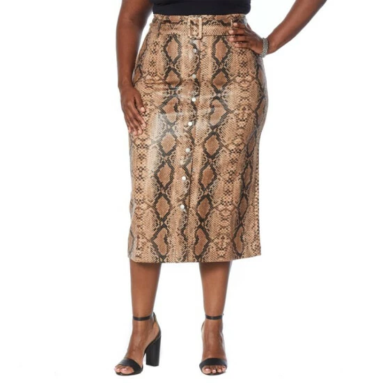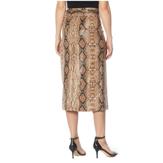 Show some (snake) skin! This effortlessly fierce, faux snakeskin leather skirtmakes a fabulous staplepiece that you can wear year round. Pair itwith a basic tank or tee for a casual weekend look, or wear it with an elegant, solidsatin blouse for a glamorous desk-to-dinner ensemble.You can also go bold and combine it with the matching shell and jacket for showstopping style โฆ if you dare.