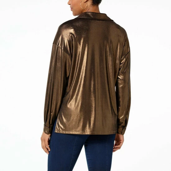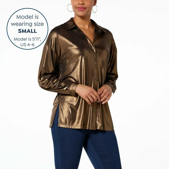 It’s your time to shine! With a metallic liquid shimmer, this button-front blousehighlights a flowy fit that pairs perfectly with pleather pants and high-heel boots or your favorite worn-in jeans and strappy sandals.