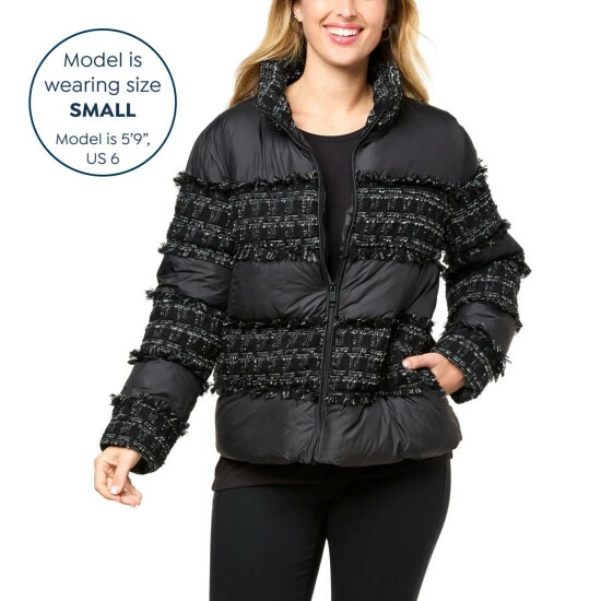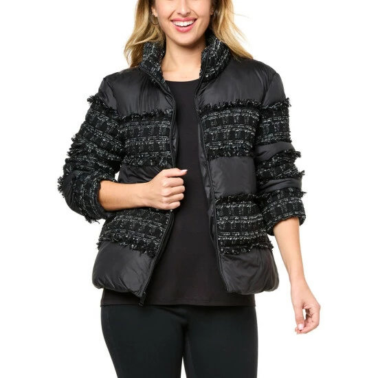 Bundle up without feeling weighed down in this zippered satinpuffer coatcomplete with stylish tweed accents andpockets to keep your hands warm.