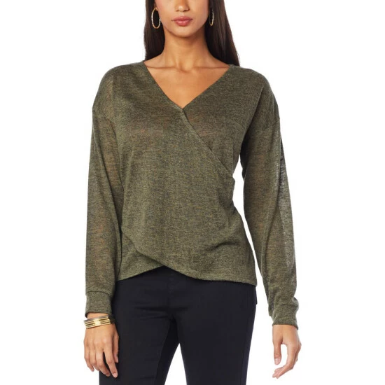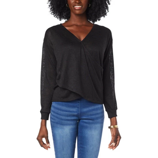 Made of soft, stretchHacci slub knit, this easy pullover is afresh take on a the classicwrap top with its flattering shape and hiddenmodesty snap.