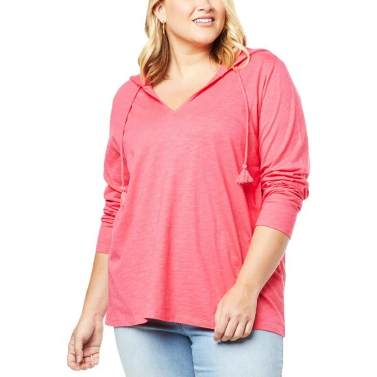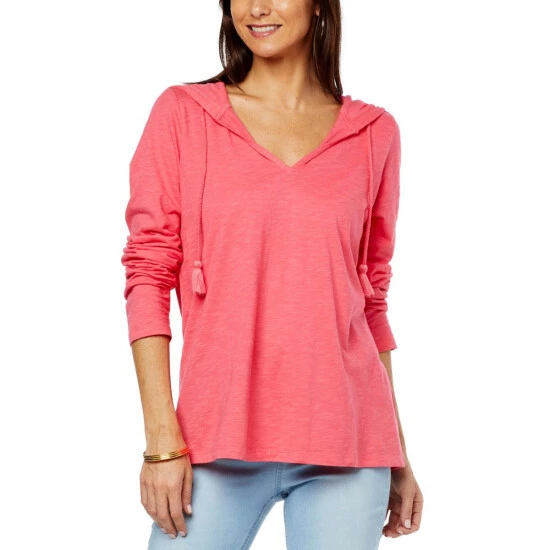 A tasseled drawstring hood adds a casual-chic touch to this classic, linen-blend summer tee.