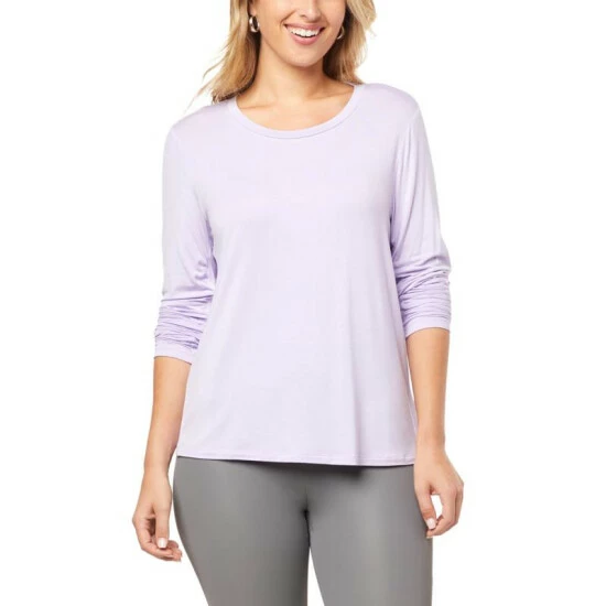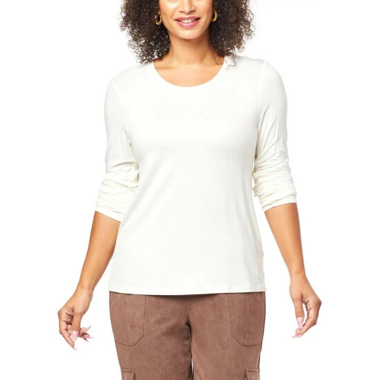 Soft and stretchable, this long, shirred sleeve t-shirt is a simple, but stylish wardrobe staple you can wear year-round.
