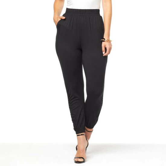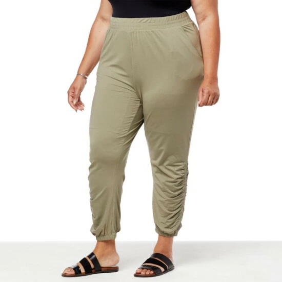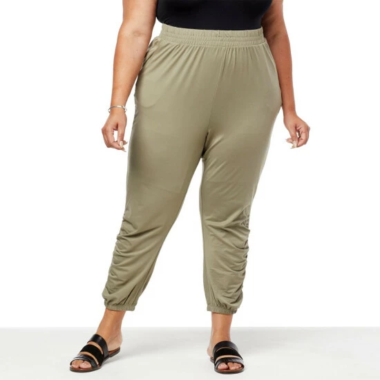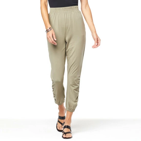 | Design Details: | Ruched, encased elastic sideseam details at bottom of each leg with tunneled, adjustable drawstring |