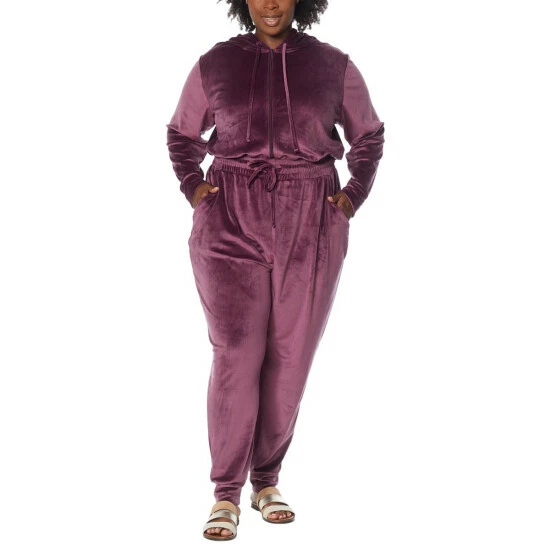 An oversized hood and soft, stretch velour fabricadd a dramatic touch to this LounGy jumpsuit from G by Giuliana.