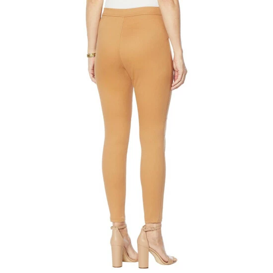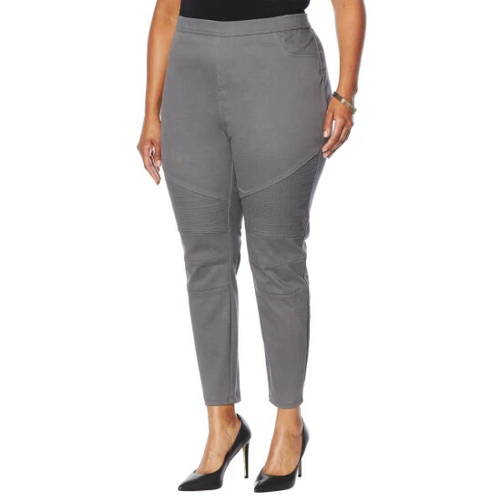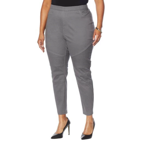 Moto chain stitching and seam detailbrings a fashionable edge to thesecomfortable, ponte kit,pull-on skinny pants from G by Giuliana.