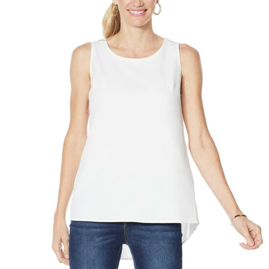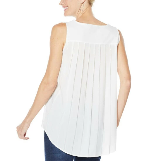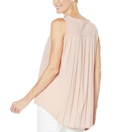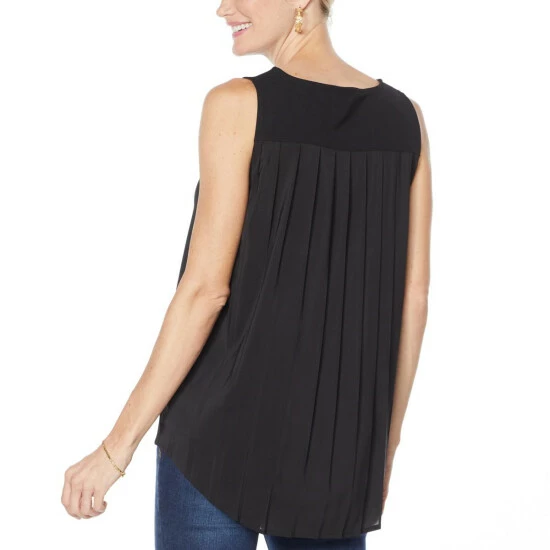 Classic in the front, drama in the rear. This top makes a chic statement with a knife-pleated back that curves for a graceful finish.
