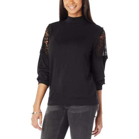 Pretty, cutout “cold” shoulder with lace and rufflesdress up this cozy French terryknittop so it can pull double duty for any desk-to-dinner look.