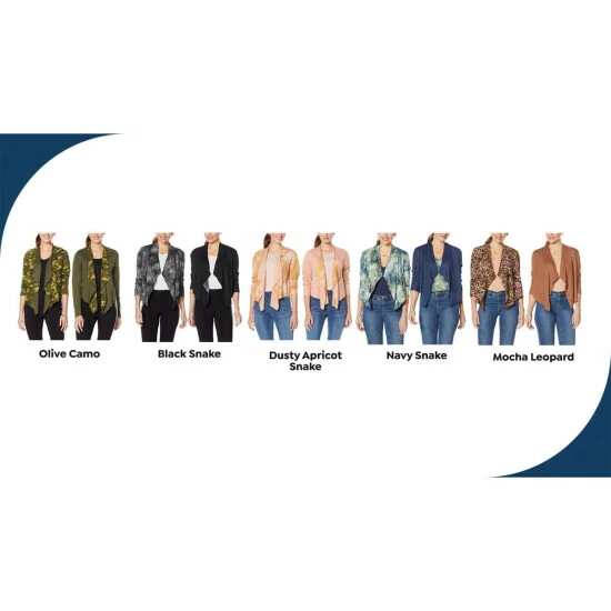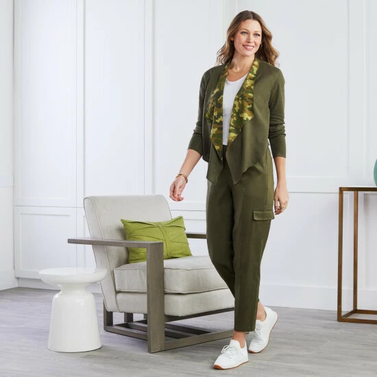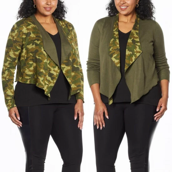 Double your options with this fully reversible cascade cardigan featuring a coordinating print and solid.