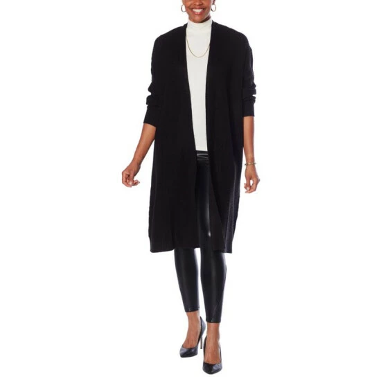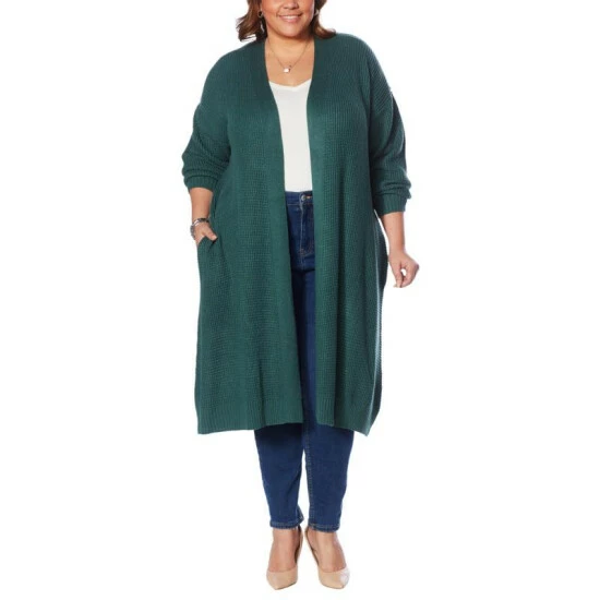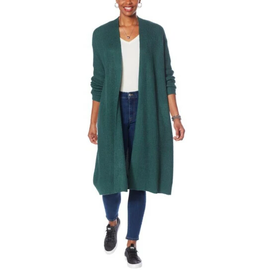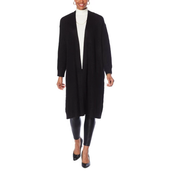 A soft, waffle-stitch texture defines this adorable everydaycardiganfeaturing a long,duster length and comfy, oversized fit.